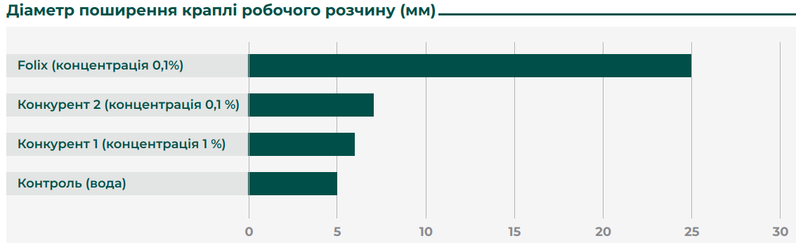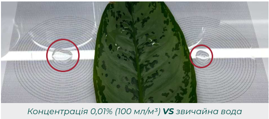 • Суперрозтікання: забезпечує повне змочування поверхні та проникнення препаратів у клітини рослини, що особливо актуально при наявності воскового нальоту.
