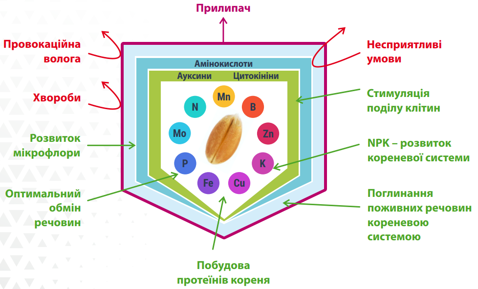 Спеціальне концентроване добриво-стимулятор для обробки насіннєвого матеріалу з високим вмістом гормонів природного походження, необхідним набором макро-, мезо- та мікроелементів, додатково збагачене комплексом вільних L-амінокислот.